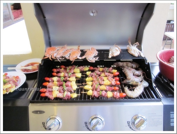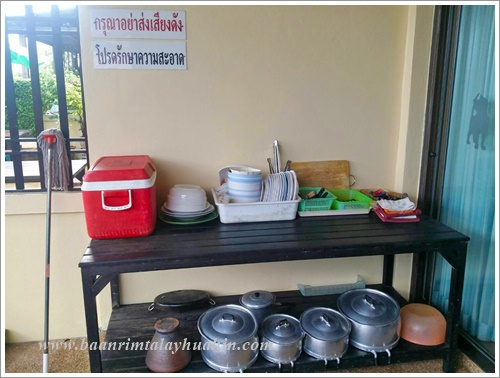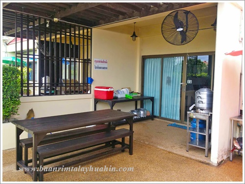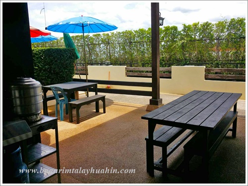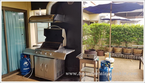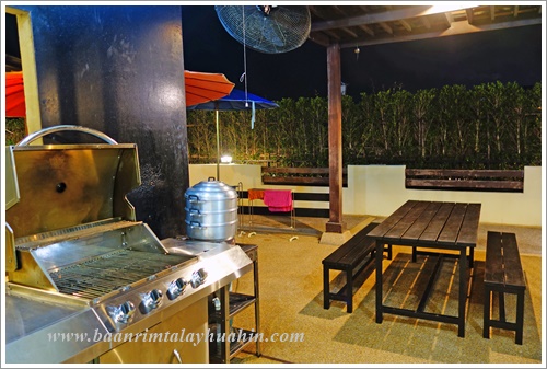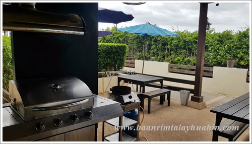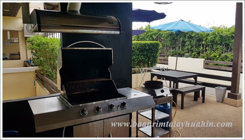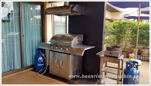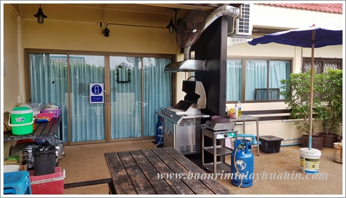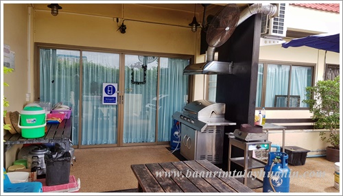 ระเบียงภายนอกชั้นสอง ที่ระเบียงมีเตาบาร์บีคิวตัวใหญ่แบบใช้แก๊สเตรียมไว้ให้ค่ะ ใช้งานง่าย ควบคุมความร้อนได้ค่ะ มีเตาแก๊สสำหรับประกอบอาหาร มีเครื่องครัวพื้นฐานทั่วไป เช่น กระทะ, หม้อ, หม้อนึ่งสองชั้น, มีด, เขียง, ครก, หม้อหุงข้าว, ไมโครเวฟ, จาน, ชาม, ช้อน, กระติกน้ำแข็ง ฯลฯ ลูกค้าเตรียมมาเฉพาะของสด เครื่องปรุงค่ะ ถ้าต้องการสั่งอาหารทะเลจากแม่บ้าน ขอเบอร์โทรแม่บ้านจากต่ายเพื่อสั่งล่วงหน้าได้นะคะ