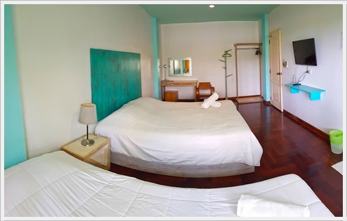 ชั้นนี้มีห้องนอน 3 ห้องค่ะ เป็นห้องนอนที่มีห้องน้ำในตัว 1 ห้อง ห้องนอนที่มีเตียงใหญ่พิเศษ 1 ห้อง และห้องนอนที่มีระเบียงเห็นวิวทะเล 1 ห้อง และมีห้องน้ำเพิ่มอีก 1 ห้องค่ะ ห้องนอน 3 - มีห้องน้ำในตัว เป็นเตียงขนาด 6 ฟุต + เตียง 3.5 ฟุต (นอนได้ 3 คน) ติดแอร์ มีทีวี