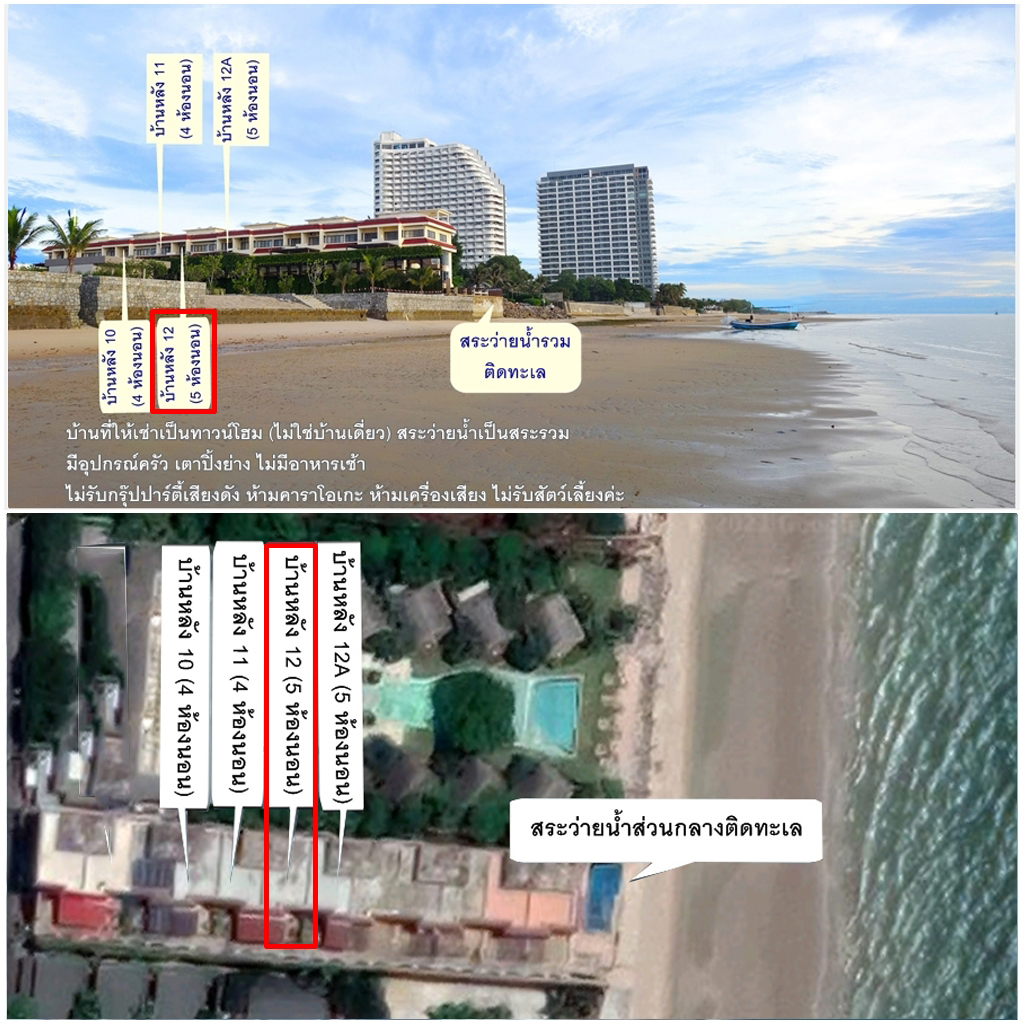 บ้านริมทะเล หัวหิน (บ้านเลขที่ 12) มี 5 ห้องนอน 6 ห้องน้ำ เงื่อนไขการเข้าพัก 1. บ้านที่ให้เช่าเป็นบ้านทาวน์โฮมไม่ใช่บ้านเดี่ยว สระว่ายน้ำเป็นสระรวมไม่ใช่สระส่วนตัว (รบกวนสวมชุดว่ายน้ำลงสระค่ะ) และไม่มีอาหารเช้าค่ะ 2. เนื่องจากข้อจำกัดด้านพื้นที่ ทางเราจึงขอให้งดใช้เครื่องเสียง ห้ามร้องคาราโอเกะ ดีดกีตาร์ ร้องเพลงค่ะ สามารถพูดคุย ทาน ดื่ม สรวลเสเฮฮา ในระดับปกติทั่วไปได้ค่ะ 3. ไม่รับสัตว์เลี้ยงทุกชนิด ไม่ว่าตัวเล็ก ตัวใหญ่ 4. หลังนี้รับลูกค้าไม่เกิน 14 คน 5. ลูกค้าต้องเตรียมของใช้สิ้นเปลือง เช่น แชมพู สบู่ กระดาษทิชชู น้ำดื่มมาเองนะคะ บ้านทาวน์โฮม 5 ห้องนอน 6 ห้องน้ำ รับลูกค้าไม่เกิน 14 คน ห้องนอนติดแอร์ทุกห้อง และมีแอร์ในห้องนั่งเล่น มีเตาบาร์บีคิวตัวใหญ่ อุปกรณ์ครัวมีให้ในบ้านครบ เตาแก๊ส เตาไมโครเวฟ กาต้มน้ำไฟฟ้า ตู้เย็น หม้อหุงข้าว กะทะ หม้อ ครก เขียง มีด จาน ชาม ช้อน แก้วน้ำ กระติกน้ำแข็ง หลังนี้มีผ้าเช็ดตัวผืนใหญ่ให้ 14 ผืนค่ะ ไม่มีผ้าเช็ดผมผืนเล็กให้นะคะ โปรโมชั่นสำหรับการเข้าพักช่วงนี้ - 26 ธันวาคม 2568 (เทศกาลปีใหม่และสงกรานต์ไม่ร่วมโปรโมชั่นนี้)