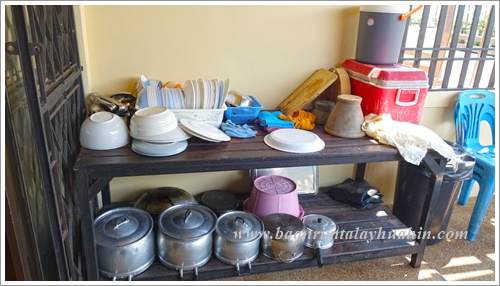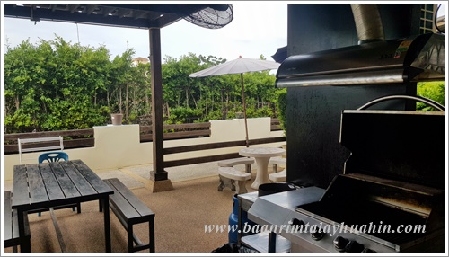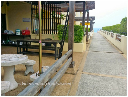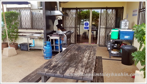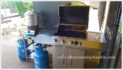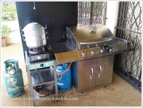 ระเบียงภายนอกชั้นสอง ที่ระเบียงมีเตาบาร์บีคิวตัวใหญ่แบบใช้แก๊สเตรียมไว้ให้ค่ะ ใช้งานง่าย ควบคุมความร้อนได้ค่ะ มีเตาแก๊สสำหรับประกอบอาหาร มีเครื่องครัวพื้นฐานทั่วไป เช่น กระทะ, หม้อ, หม้อนึ่งสองชั้น, มีด, เขียง, ครก, หม้อหุงข้าว, ไมโครเวฟ, จาน, ชาม, ช้อน, กระติกน้ำแข็ง ฯลฯ ลูกค้าเตรียมมาเฉพาะของสด เครื่องปรุงค่ะ ถ้าต้องการสั่งอาหารทะเลจากแม่บ้าน ขอเบอร์โทรแม่บ้านจากต่ายเพื่อสั่งล่วงหน้าได้นะคะ