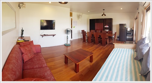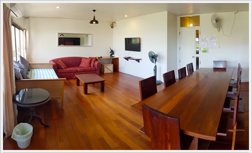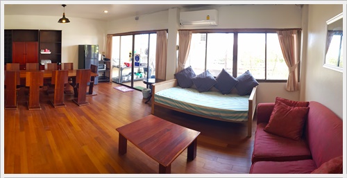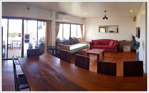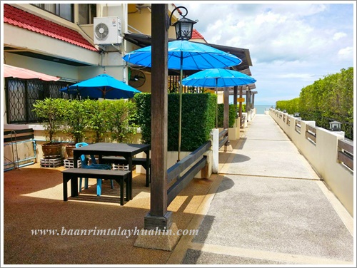 มีห้องน้ำในตัว ชั้นสอง มีห้องนั่งเล่นซึ่งเป็นห้องรับประทานอาหารด้วย ติดแอร์ มีทีวี เป็น Smart TV พร้อม Netflix มี Wifi อินเตอร์เน็ตความเร็วสูงค่ะ มีโซฟานั่งเล่น โต๊ะรับประทานอาหารสำหรับ 10 ที่นั่ง มีตู้เย็น พร้อมอุปกรณ์ครัวครบ มีเตาบาร์บีคิวตัวใหญ่แบบใช้แก๊ส และมีประตูเปิดไประเบียงซึ่งระเบียงนี้จะเชื่อมต่อเนื่องกันตลอดแนวตึกค่ะ เดินไปสุดทางเดินระเบียง จะมีบันไดลงไปสระว่ายน้ำของโครงการด้านล่างและเดินลงไปชายหาดได้ค่ะ ภาพชั้นสอง