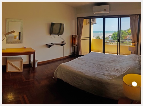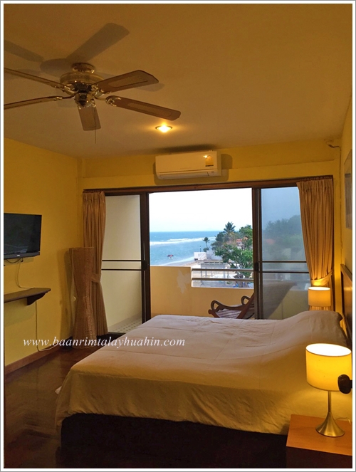 ห้องนี้มีระเบียงเห็นวิวทะเล เตียง