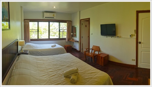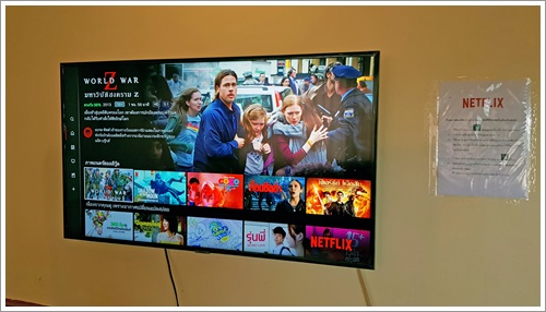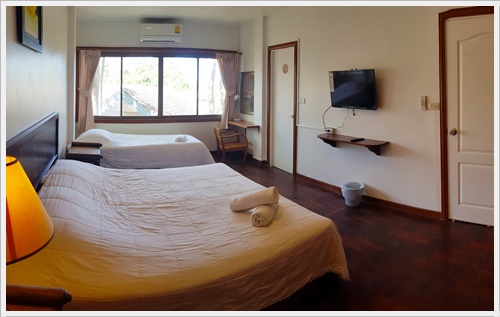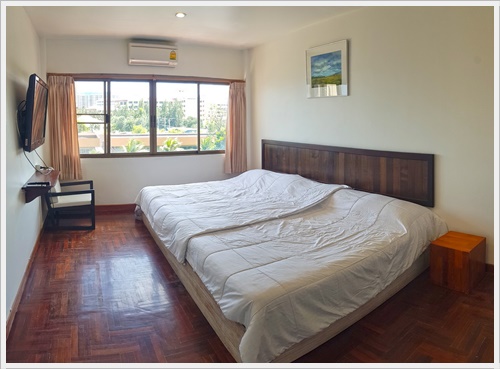 - ห้องนอน 1 เตียง 6 ฟุต 1 เตียง นอนได้ 2 คน ติดแอร์ มีโทรทัศน์