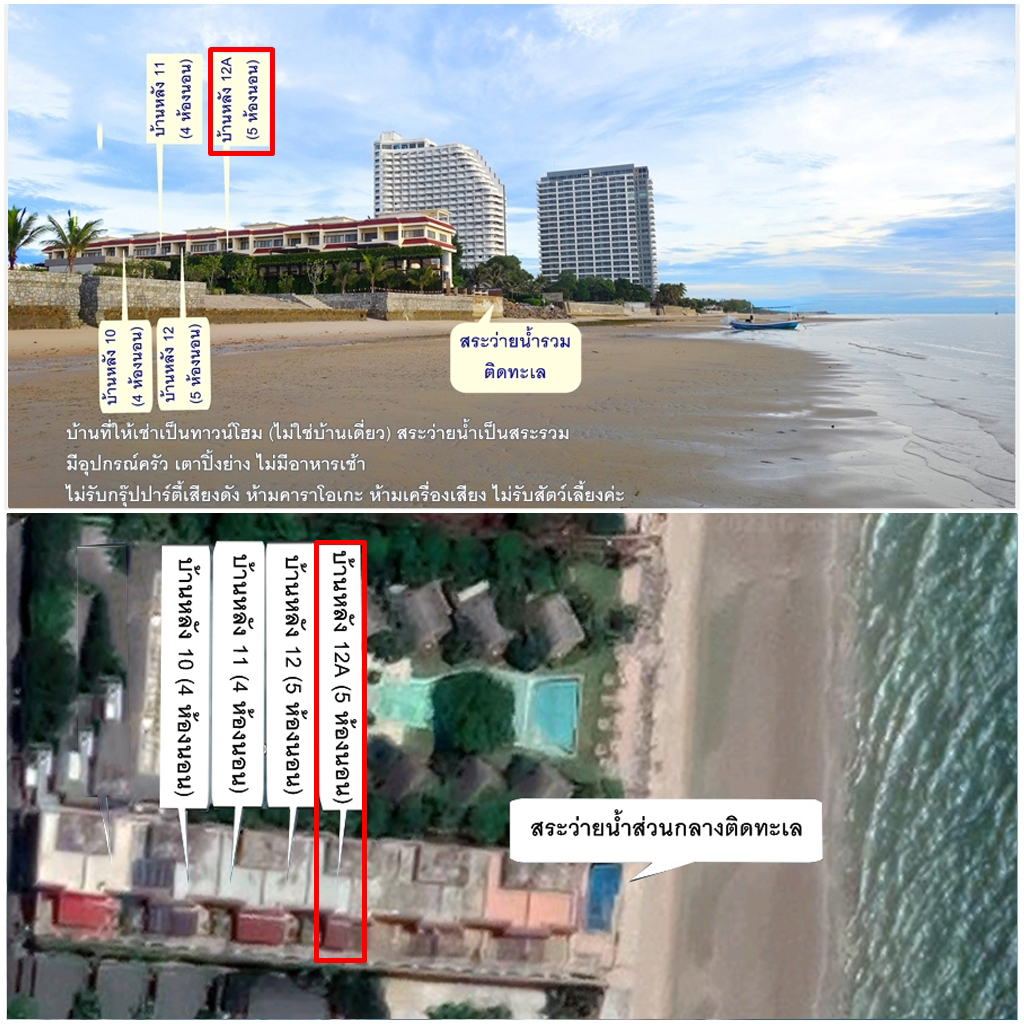 บ้านริมทะเล หัวหิน (บ้านเลขที่ 12A มี 5 ห้องนอน 6 ห้องน้ำ) เงื่อนไขการเข้าพัก 1. บ้านที่ให้เช่าเป็นบ้านทาวน์โฮมไม่ใช่บ้านเดี่ยว สระว่ายน้ำเป็นสระรวมไม่ใช่สระส่วนตัว (รบกวนสวมชุดว่ายน้ำลงสระค่ะ) และไม่มีอาหารเช้าค่ะ 2. เนื่องจากข้อจำกัดด้านพื้นที่ ทางเราจึงขอให้งดใช้เครื่องเสียง ห้ามร้องคาราโอเกะ ดีดกีตาร์ ร้องเพลงค่ะ สามารถพูดคุย ทาน ดื่ม สรวลเสเฮฮา ในระดับปกติทั่วไปได้ค่ะ 3. ไม่รับสัตว์เลี้ยงทุกชนิด ไม่ว่าตัวเล็ก ตัวใหญ่ 4. หลังนี้รับลูกค้าไม่เกิน 14 คนค่ะ 5. ลูกค้าต้องเตรียมของใช้สิ้นเปลือง เช่น แชมพู สบู่ กระดาษทิชชู น้ำดื่มมาเองนะคะ บ้านทาวน์โฮม 5 ห้องนอน 6 ห้องน้ำ รับลูกค้าไม่เกิน 14 คน ห้องนอนติดแอร์ทุกห้อง และมีแอร์ในห้องนั่งเล่น มีเตาบาร์บีคิวตัวใหญ่ อุปกรณ์ครัวมีให้ในบ้านครบ เตาแก๊ส เตาไมโครเวฟ กาต้มน้ำไฟฟ้า ตู้เย็น หม้อหุงข้าว กะทะ หม้อ ครก เขียง มีด จาน ชาม ช้อน แก้วน้ำ กระติกน้ำแข็ง หลังนี้มีผ้าเช็ดตัวผืนใหญ่ให้ 14 ผืนค่ะ ไม่มีผ้าเช็ดผมผืนเล็กให้นะคะ โปรโมชั่นสำหรับการเข้าพักช่วงนี้ - 26 ธันวาคม 2568 (เทศกาลปีใหม่และสงกรานต์ไม่ร่วมโปรโมชั่นนี้)
